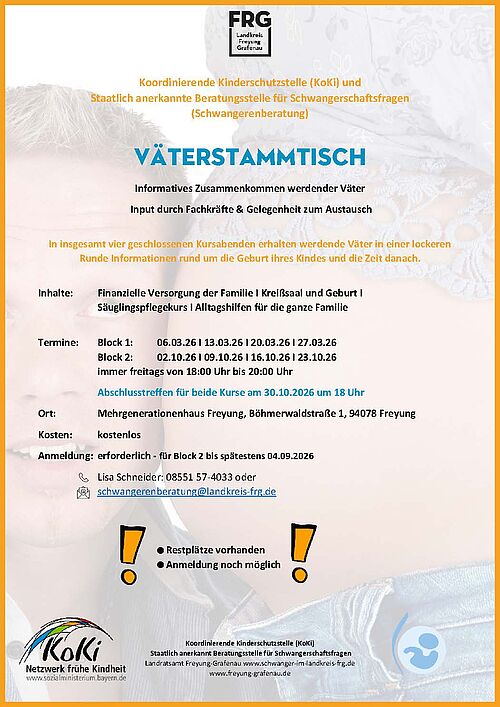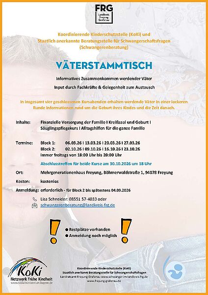 Mit dem positiven Schwangerschaftstest beginnt nicht nur für die Frauen, sondern auch für ihre Männer eine neue Lebensphase – geprägt von Vorfreude, Fragen und manchmal auch Unsicherheit. Ein neues kostenloses Angebot des Landratsamtes Freyung Grafenau soll nun genau in dieser Phase Unterstützung bieten: der Väterstammtisch. Im Alltag voller Fragen, Vorfreude und Unsicherheit bietet der Väterstammtisch Raum für Begegnung, Austausch und gegenseitige Unterstützung. Eine feste Gruppe aus werdenden Vätern bekommt ab Freitag, 6. März, in vier Treffen fachlichen Input und kann in lockerer Runde Gespräche über ihre neue Lebensphase und die damit einhergehenden Herausforderungen führen.