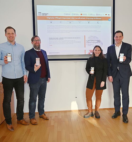 Stellten die neue leicht zugänglichen digitale Plattform zum Thema Pflege und Angebote für Senioren und Menschen mit Handicap im Landkreis vor (von rechts) vor: Landrat Sebastian Gruber, Lena Schandra, Projektleitung Smartes Land ILE Ilzer Land, Christian Fiebig, Sachgebietsleiter Landkreisange-legenheiten und René Kurtz, Leitung GesundheitsregionPlus Landkreis Freyung-Grafenau.