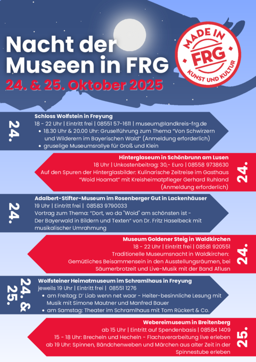 Am 24. und 25. Oktober 2025 heißt es im Landkreis Freyung-Grafenau zum ersten Mal: Türen auf für die Nacht der Museen in FRG! Die Museumsnächte haben bereits eine lange Tradition in den einzelnen Häusern. Das neue Veranstaltungsformat ist im vergangenen Jahr aus dem Netzwerk der Museen entstanden und lädt Kultur- und Geschichtsbegeisterte ebenso wie Familien zu einem abwechslungsreichen Abendprogramm ein.
