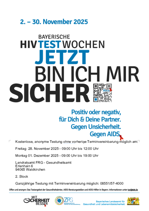 Der Welt-AIDS-Tag ist der Tag der Solidarität mit Menschen mit HIV und des Gedenkens an die an AIDS Verstorbenen. Er wird seit 1988 jedes Jahr am 1. Dezember begangen. Aus diesem Anlass bietet das Gesundheitsamt Freyung-Grafenau am Freitag, 28. November 2025, von 09:00 Uhr bis 12:00 Uhr sowie am Montag, den 1.12.2025, von 09:00 Uhr bis 19:00 Uhr ein kostenloses Testangebot in den Räumen des Gesundheitsamtes an (Erlenhain 6, Waldkirchen, 2. Stock). Eine Anmeldung ist dafür nicht notwendig.
